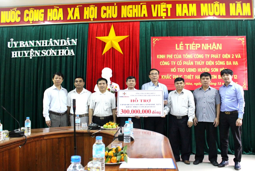 Cơn bão số 12 đi qua đã gây thiệt hại nặng nề về vật chất, tinh thần và cả con người khiến đời sống của người dân miền Trung lâm vào hoàn cảnh khó khăn, đặc biệt là về y tế, giáo dục. Để chung tay góp sức và chia sẻ cùng đồng bào miền Trung ruột thịt, phát huy truyền thống đoàn kết, tương thân tương ái và trách nhiệm với xã hội. Sáng ngày 08/12/2017, tại Văn phòng UBND huyện Sơn Hòa, Tổng công ty Phát điện 2 - Công ty Cổ phần Thủy điện Sông Ba Hạ đã tổ chức trao tiền hỗ trợ khắc phục những thiệt hại sau bão.